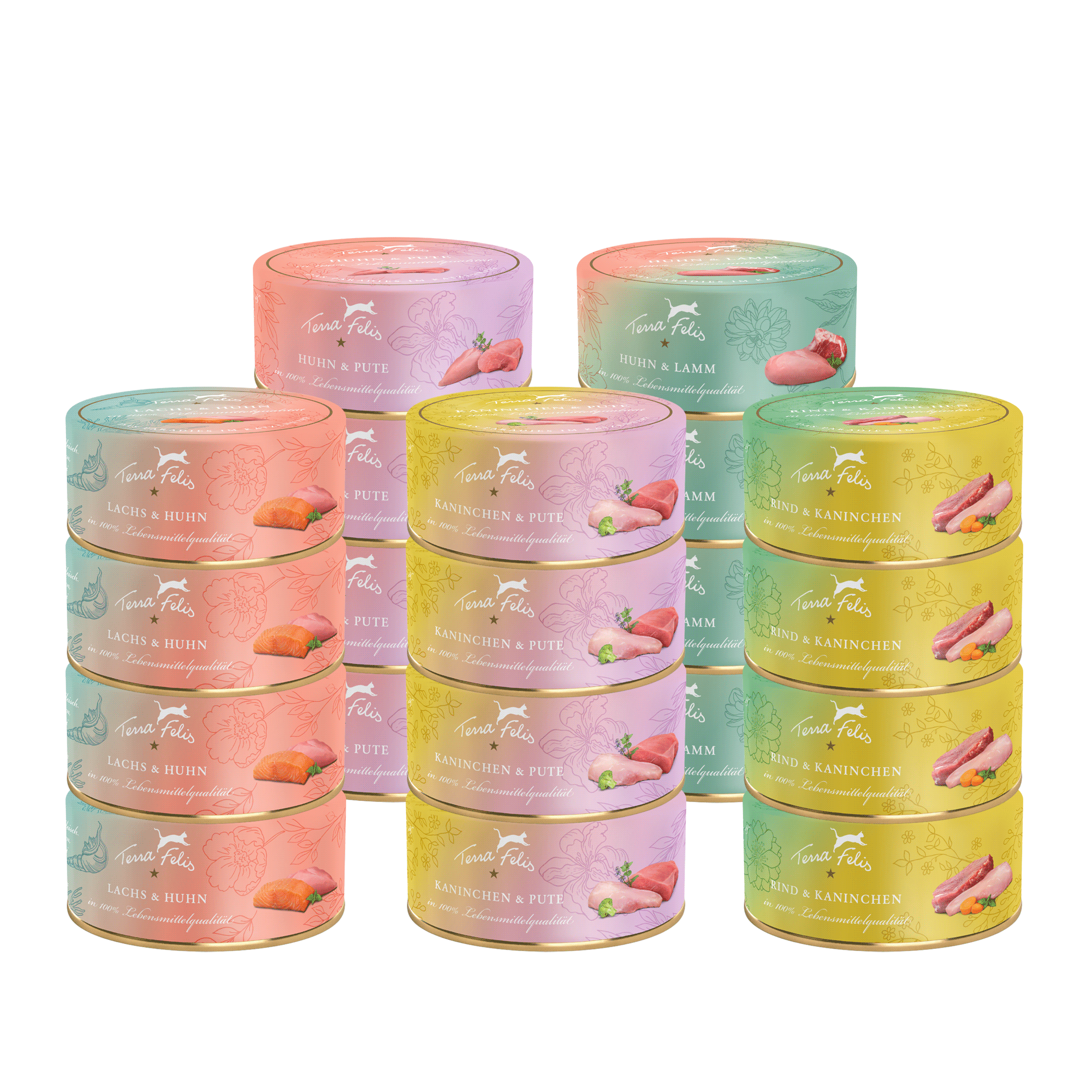 Con il 90% di carne e nutrienti interiora, i menù senza cereali di Terra Felis presentano una quota di carne molto alta. In tal modo, il gatto, che è un carnivoro in senso stretto, ottiene gli importanti acidi grassi Omega 6 e tante proteine animali necessarie per la produzione di energia e tutti i processi metabolici. Per il buon funzionamento di intestino e peristalsi intestinale, il gatto ha bisogno di una bassa quota di fibre. Tutti i menù di Terra Felis vengono quindi integrati con una varietà di verdura selezionata ed erba gatta. Le ricette vengono poi completate aggiungendo taurina e olio di colza, ricco di acidi grassi Omega 3. Gli ingredienti utilizzati sono esclusivamente di qualità human-grade al 100%. Qualità e freschezza si esprimono attraverso l’appetitoso, delizioso aroma dei menù, che garantisce un buon gradimento da parte dei felini.